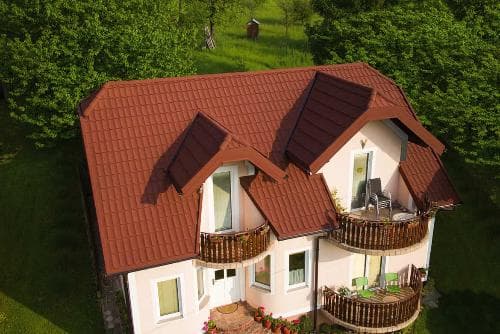 Композитная черепица Gerard Diamant, 1270x398мм, redwood это новейшее решение для кровли, сочетающее в себе прочность, эстетику и простоту монтажа. Она состоит из строго геометрических элементов, которые индивидуально соединяются между собой. композитная черепица доступна в разнообразных цветах и стилях, позволяя подобрать такую, которая идеально сочетается с архитектурой дома.