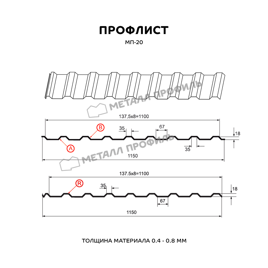 Профиль МП-20 имеет толщину 0,5 мм, что обеспечивает прочность и долговечность конструкции.