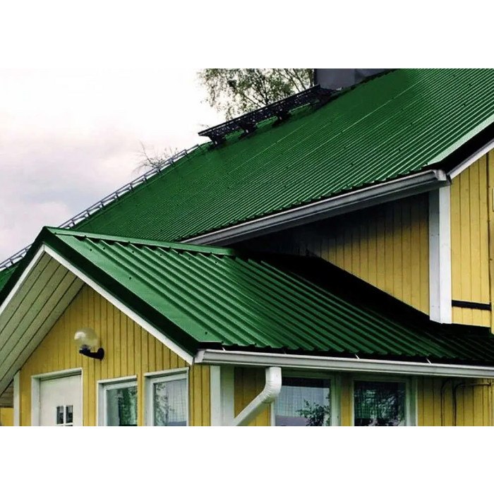 Цвет профлиста - зеленый (RAL 6002), который отлично сочетается с различными стилями и цветовыми решениями. Он придает зданию элегантность и привлекательность.